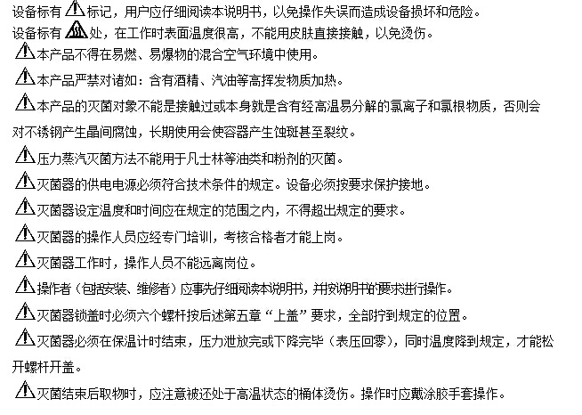 標(biāo)記,表示在工況條件下滅菌器表面溫度很高,使用時請操作者的人體肌膚不能直接接觸桶體,以防燙傷;