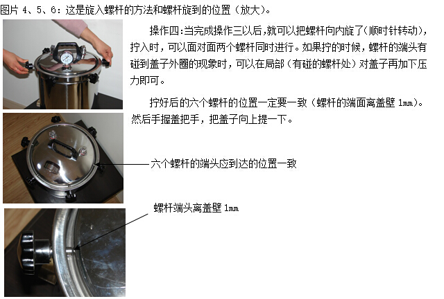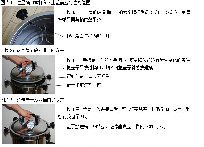 c 適當(dāng)退出已經(jīng)擰在滅菌器桶口邊上的膠木螺釘,使螺釘端頭離開器蓋的邊緣,然后小心提起器蓋。切勿使用提拉放汽管的方法提起器蓋。