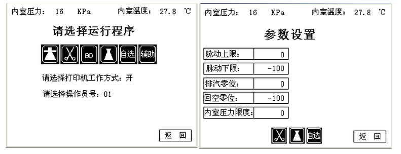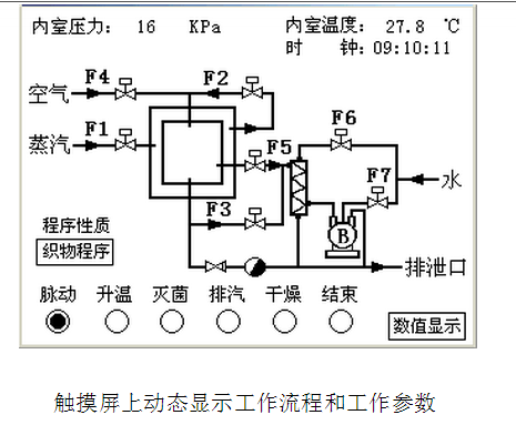 菌過(guò)程的溫度、壓力、時(shí)間、過(guò)程階段、預(yù)置參數(shù)等均在觸摸屏顯示器中自動(dòng)顯示并可以隨時(shí)儲(chǔ)存,并配有微型打印機(jī)進(jìn)行打印工作過(guò)程參數(shù)以便于歸檔、備查。此外,該控制系統(tǒng)配備有一套完整的自測(cè)及校正程序,可以實(shí)現(xiàn)不同海拔高度下、不同地區(qū)的壓力、溫度等參數(shù)的校正;還具有多級(jí)控制保護(hù)、幫助功能。