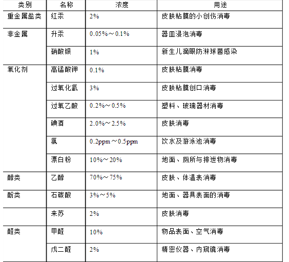 具有殺死微生物的化學(xué)藥物稱消毒劑。消毒劑對(duì)人體有毒性作用,只能外用,不能內(nèi)服。主要用于皮膚粘膜的傷口、器械、排泄物和周圍環(huán)境的消毒。消毒劑在低濃度時(shí)也可作防腐用,但防腐劑的關(guān)鍵是應(yīng)要對(duì)人體無毒性作用。消毒劑種類濃度與用途見表 13-1。 常用消毒劑的種類濃度與用途